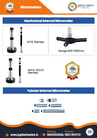 ESTD 1965 BEST PRODUCT Micrometers Taper Gauges Mechanical Internal Micrometer XTA Series Range 400-1150mm ESTD MTA ‘ECO’ 1965 Series BEST PRODUCT Tubular Internal Micrometer 25 Rekhang Murtaza www.jupitertraders.in 9892092006, 9821599751